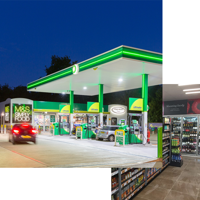 We have a 12 pump BP filling station with 12 additional parking spaces. The facility incorporates a M&S Simply Food and EV car chargers.